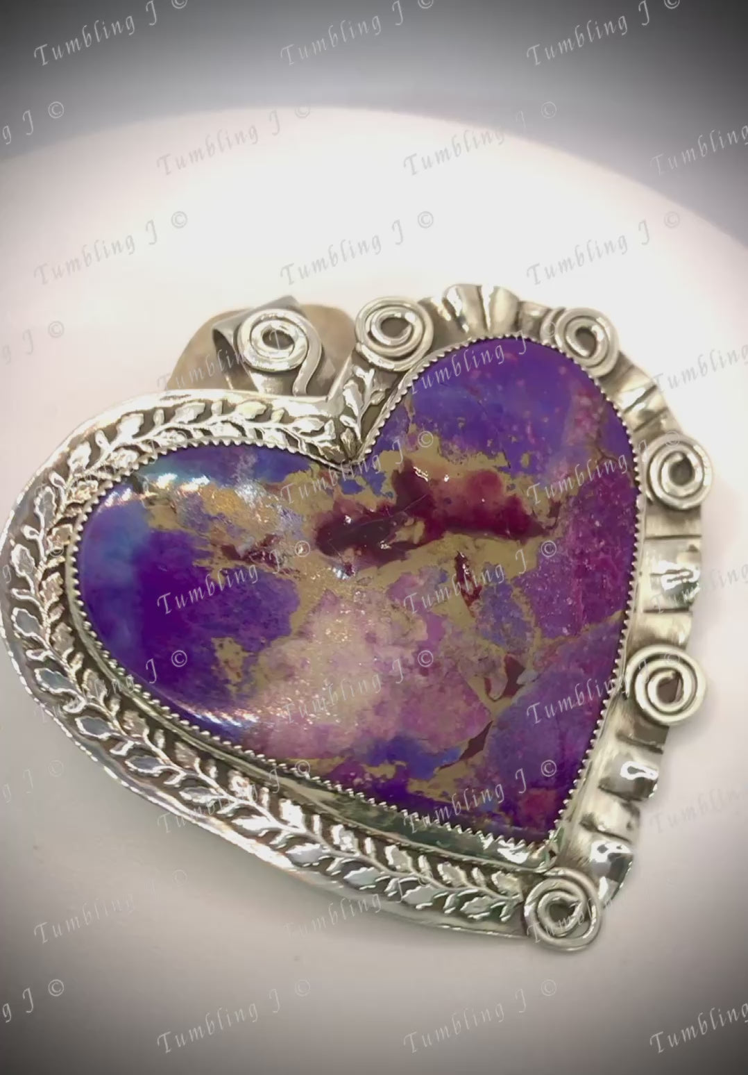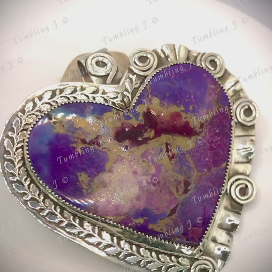 Crafted with a large, bold purple Mojave heart cabochon and a hand formed ruffle border, this sterling silver pendant also features lighthearted curly cues for a fun and unique touch. Perfect for the lighthearted and quirky fashionista in you!