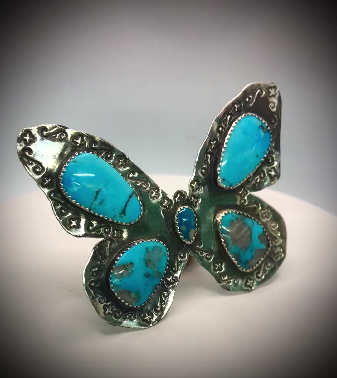 Five genuine Blue Bird turquoise stones set in hand-forged sterling silver with intricate stampwork that catches light from every angle. The dimensional wings span a full 3” x 3”—designed to cover the back of your hand in the most graceful, captivating way.